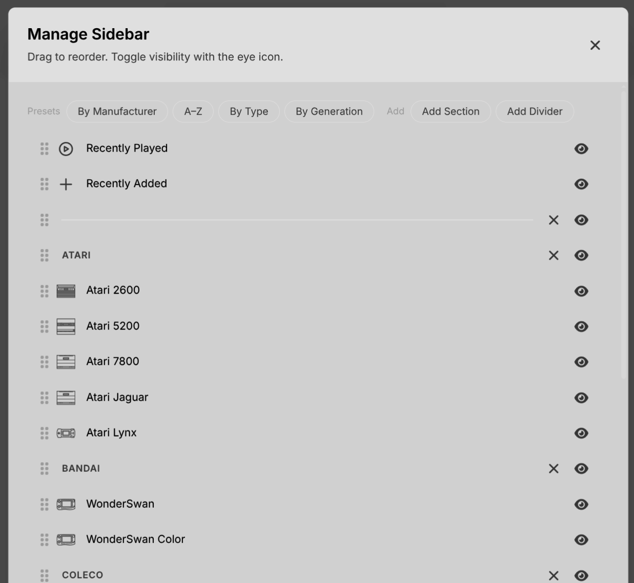 Drag and drop platforms to reorder your sidebar.